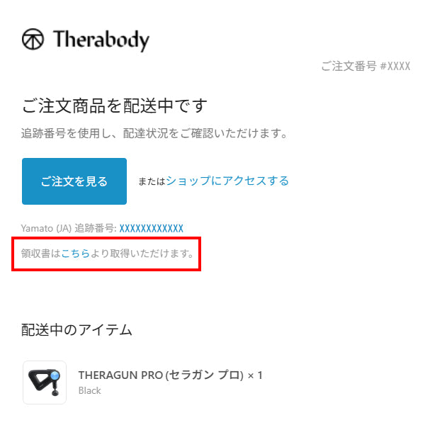 件名:【Therabody Online Shop】ご注文商品を発送しました ※出荷が完了し、ヤマト運輸のお荷物追跡番号をお知らせするメールです。 記載内容:ご注文番号/ご注文内容/ヤマト運輸の【追跡番号】 |